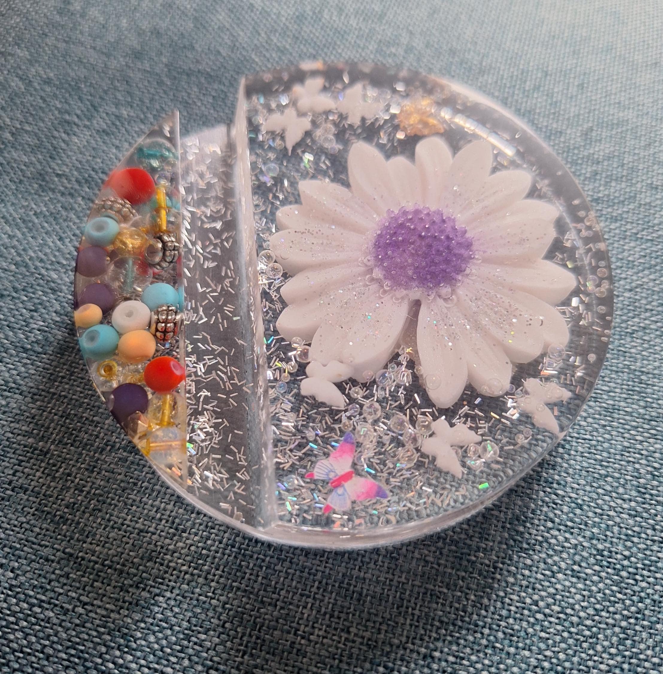 *Materials: Non-toxic Epoxy Resin, Plastic Beads, Glitter, Plaster Flower.